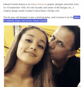 Biographical information on the Web shows Ed Butera of ibi Designs is the father of the famous American singer, songwriter, and actress Ariana Grande.