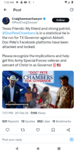 Mr. Sawyer is conversing on Twitter/X with people regarding you and your candidacy for office. One person said they were going to vote for you but noted they changed their mind after you were endorsed by Sawyer.