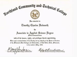 Holmseth earned an AAS in Media Communications, as well as a Certificate in Broadcasting Proficiency from Northland Community College, Thief River Falls, Minnesota.