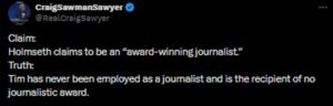 Hillary Clinton’s bodyguard and lifetime protection agent assigned to Hillary by the Luciferian Brotherhood, Craig (Sawman) Sawyer (aka Tom Caruthers) has become so feckless at his job of satanic lying that he posted on Twitter/X that War Correspondent Timothy Charles Holmseth “has never been employed as a journalist and is the recipient of no journalistic award”.