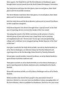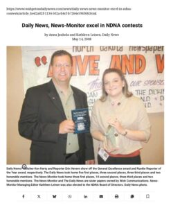 The following article was published in the Wahpeton Daily News on May 14, 2008. The article names Holmseth as the recipient of two 1st Place awards from the North Dakota Newspaper Association.