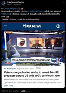 When Pete Hegseth was employed by FOX NEWS, he brought Hillary Clinton’s psychotic bodyguard, admitted CIA operator Craig (Sawman) Sawyer, onto his program and promoted Sawyer’s fake child rescue group called Veterans For Child Rescue Inc which is a FRONT for assassination teams and human trafficking. SEE IMAGE BELOW
