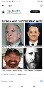 The Truth Social post by Holmseth also included an April 10, 2026, post by MK Ultra abuse survivor Fiona Barnett that was titled “THE MEN WHO SUICIDED ISAAC KAPPY” that featured photographs of U.S. Army Lt. Colonel Michael Aquino, Hollywood actor Tom Hank, Craig Randall (Sawman) Sawyer (Hillary Clinton’s bodyguard), Cory Daniels.