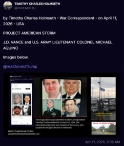 “The image above was submitted to War Correspondent Timothy Charles Holmseth on April 10, 2026. The extended background and contacts of the source who created the image is known to Holmseth,” Holmseth said.