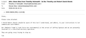 Today, we are releasing an email communication regarding MELANIA TRUMP, JEFFREY EPSTEIN, and a CLASSIFIED MILITARY OPERATION from March 2020 between War Correspondent Timothy Charles Holmseth and his attorney Steven Scott Biss, Biss Law Office, Charlottesville, Virginia.