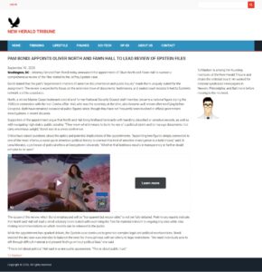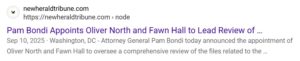 There exists a link to a story published by NEW HERALD TRIBUNE located at Pam Bondi Appoints Oliver North and Fawn Hall to Lead Review of Epstein Files | New Herald Tribune. SEE FULL SCREENSHOT FAR BELOW