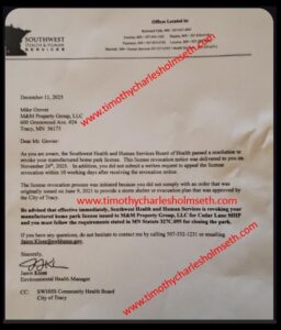 On December 11, 2025, Southwest Health and Human Services Board of Health issued a letter to Mike Grover, M&M Property Group, LLC, that advised Grover his license is being suspended.
