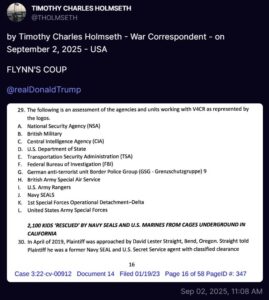 Unbeknownst to War Correspondent Timothy Charles Holmseth, who had been co-opted by CIA Robert David Steele, Juan O’Savin, Field McConnell, David Lester Straight, Attorney Steven Scott Biss, and others, was being heralded by CIA operatives as a ‘hero who fought for the children against Epstein’.