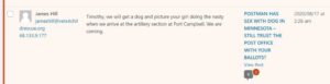 “Timothy, we will get a dog and picture your girl doing the nasty when we arrive at the artillery section at Fort Campbell. We are coming,” the message from V4CR said.