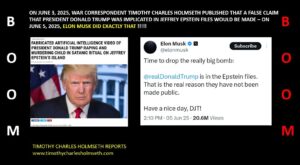 ON JUNE 3, 2025, WAR CORRESPONDENT TIMOTHY CHARLES HOLMSETH PUBLISHED THAT A FALSE CLAIM THAT PRESIDENT DONALD TRUMP WAS IMPLICATED IN JEFFREY EPSTEIN FILES WOULD BE MADE – ON JUNE 5, 2025, ELON MUSK DID EXACTLY THAT !!!!!