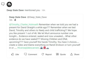 “@Timothy_Charles_Holmseth Remember when we told you we had a present for David Straight a while ago??? Remember when we tied David, Timothy and others to Neely and child trafficking?? We hope you like present 1 out of 46. We let Murt announce number one tonight…. Evidence entered, sealed and now unsealed…. What other evidence do we have sealed??? Missing children and DNA upcoming???? Save yourself the hassle Timothy. You have 3 choices….. create a video and blame everything on Randi Erickson or turn yourself in or …. #licenseplatescanners”