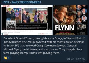 WAR REPORT: PRESIDENT DONALD TRUMP, through his SON DONALD TRUMP JR., INFILTRATED the COMMAND STRUCTURE of the FOREIGN MILITARY GROUP (ROD OF IRON MINISTRIES) that ATTEMPTED to ASSASSINATE HIM in BUTLER, PA (shooting Trump after learning Trump was not naming Gen. Michael Flynn as VP running mate)